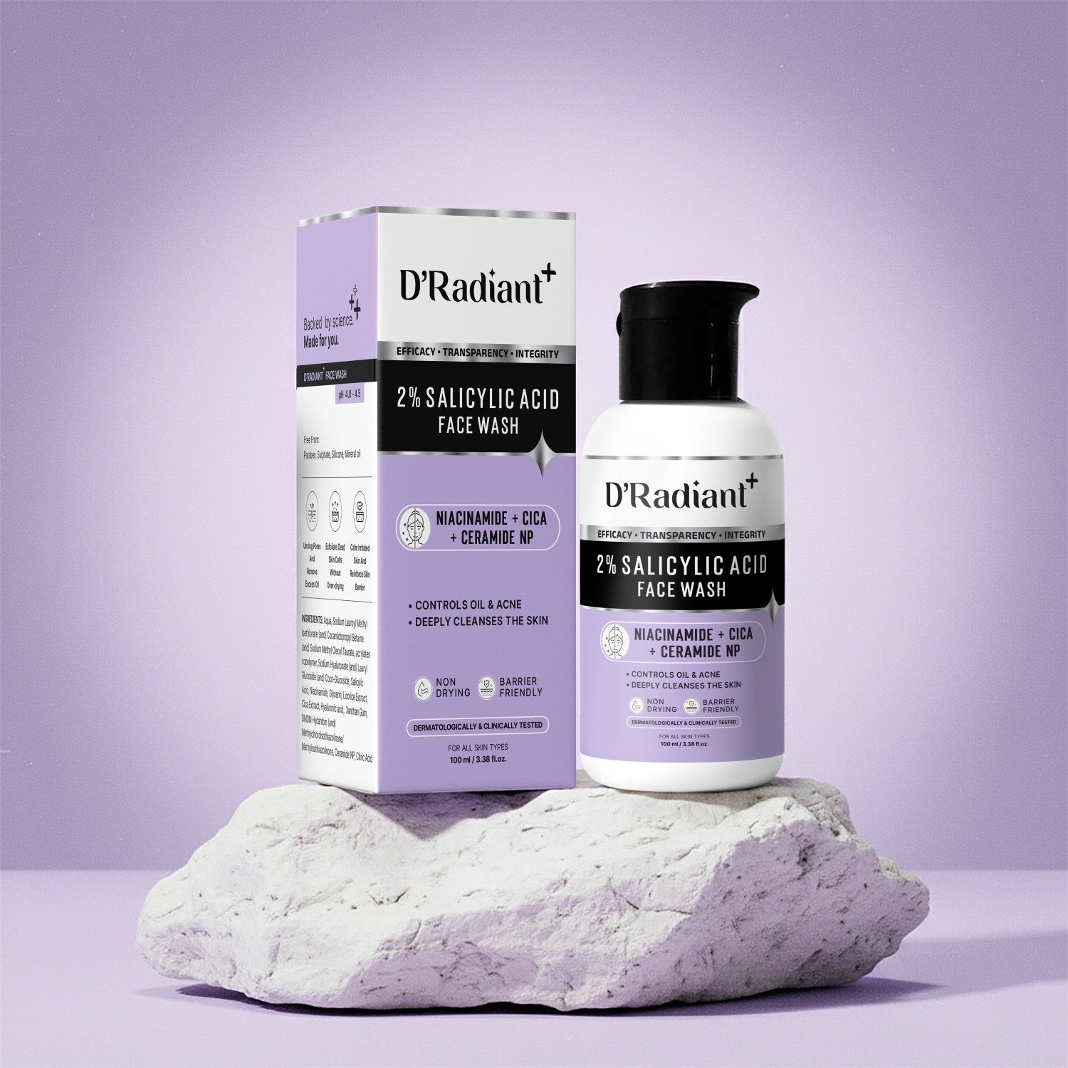 D’Radiant+ 2% Salicylic Acid Facewash | Anti Acne Cleanser with Niacinamide, Cica & Ceramide NP | Oil Control, Deep Pore Cleansing Without Over Drying | Dermatologically & Clinically Tested (100ml)