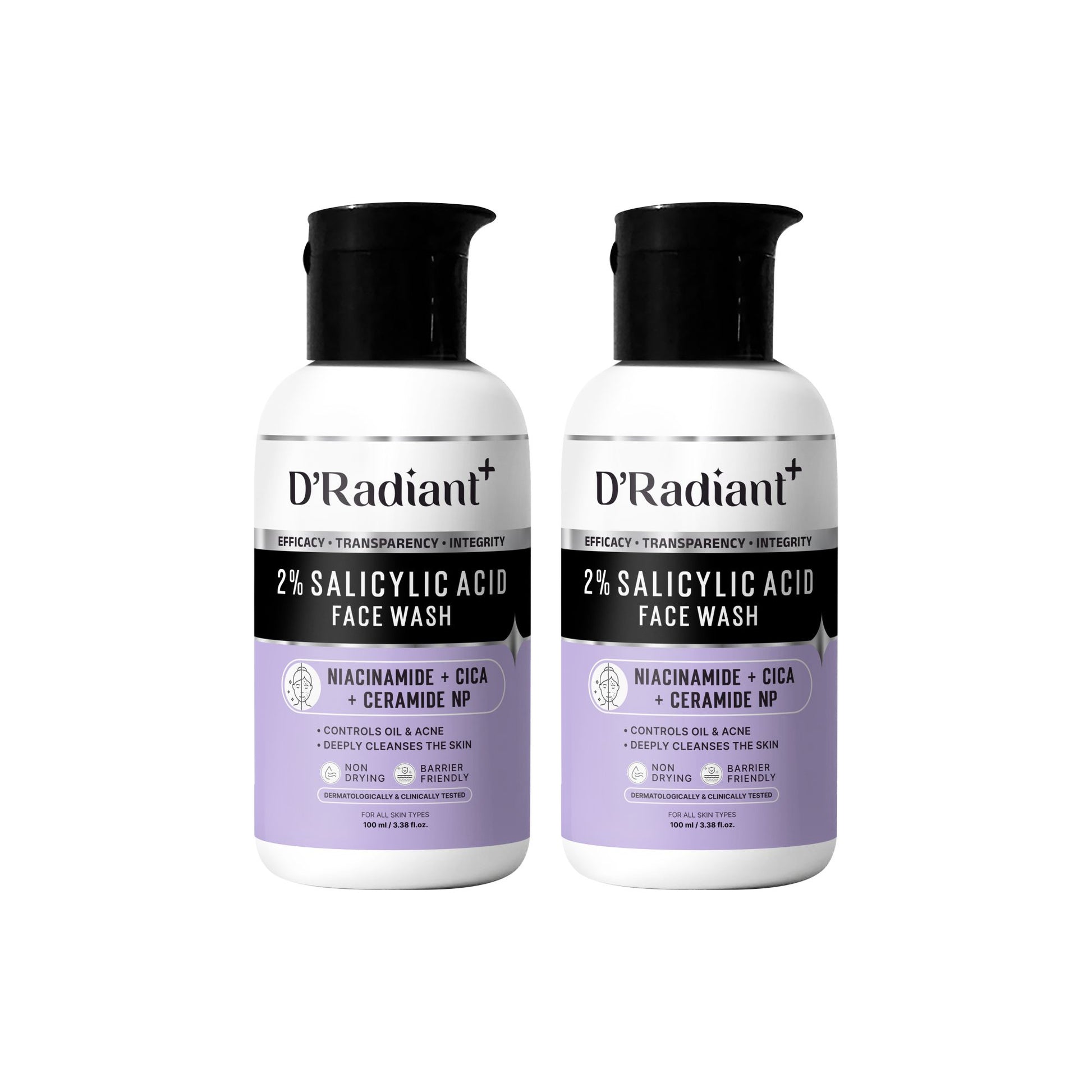 D’Radiant+ 2% Salicylic Acid Face Wash – A dermatologically tested acne face wash designed to control oil, reduce acne, and deeply cleanse pores without over-drying the skin. Enriched with Niacinamide, CICA, and Ceramide NP, this gentle cleanser helps soothe irritation, strengthen the skin barrier, and promote healthy, clear skin. Free from parabens, sulfates, silicones, and mineral oils, making it safe for daily use on all skin types, including acne-prone and sensitive skin.It have pH-Balanced of 4 to 4.5