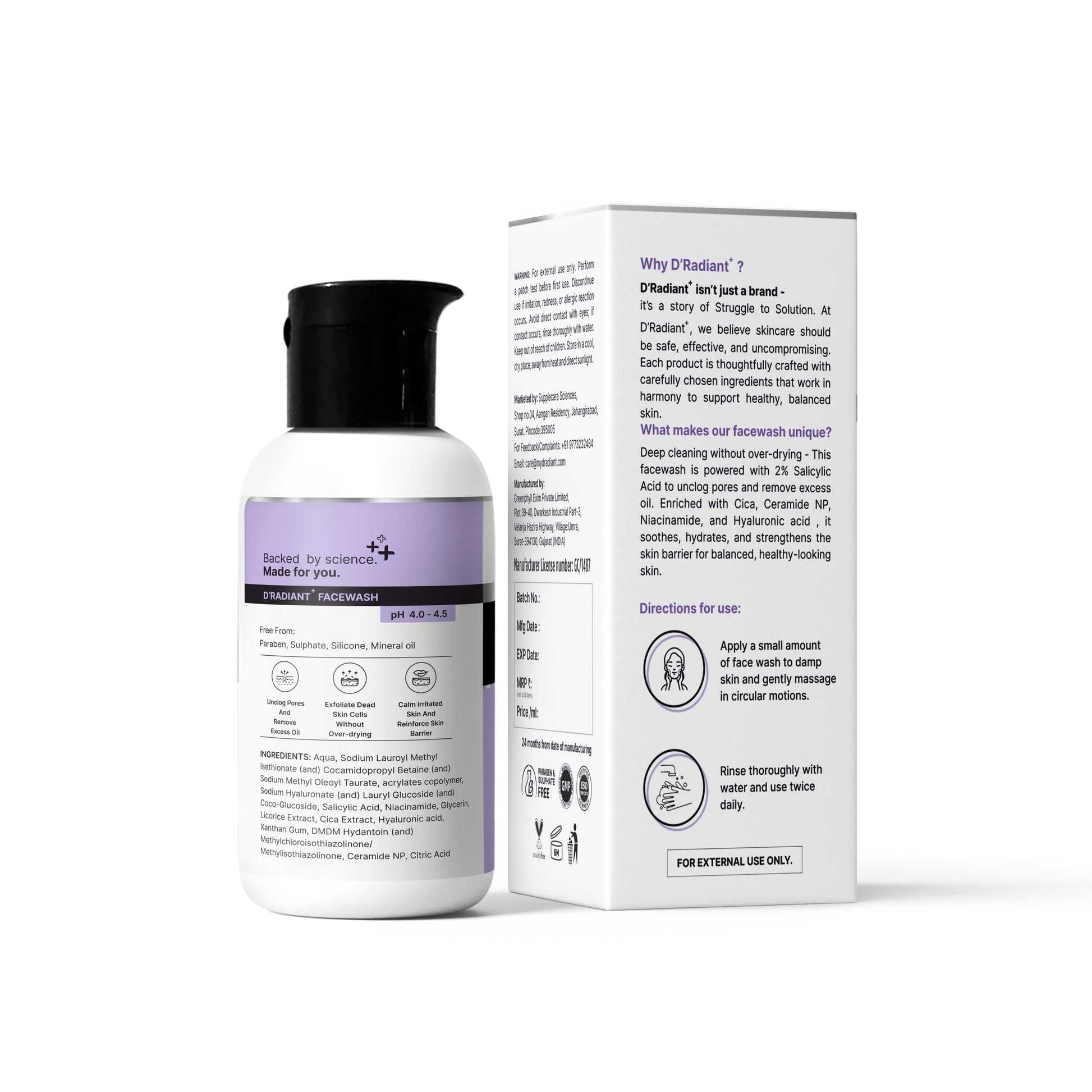D’Radiant+ 2% Salicylic Acid Face Wash – A dermatologically tested acne face wash designed to control oil, reduce acne, and deeply cleanse pores without over-drying the skin. Enriched with Niacinamide, CICA, and Ceramide NP, this gentle cleanser helps soothe irritation, strengthen the skin barrier, and promote healthy, clear skin. Free from parabens, sulfates, silicones, and mineral oils, making it safe for daily use on all skin types, including acne-prone and sensitive skin.It have pH-Balanced of 4 to 4.5